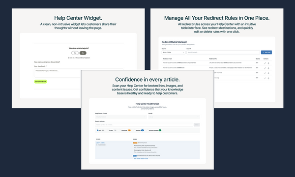 Lotus Themes launches three new Zendesk Marketplace apps: Article Feedback for collecting visitor input, Help Center Health Check for finding broken links and content issues, and Redirect Rules Manager for handling URL redirects. All three work directly in your Agent Workspace.