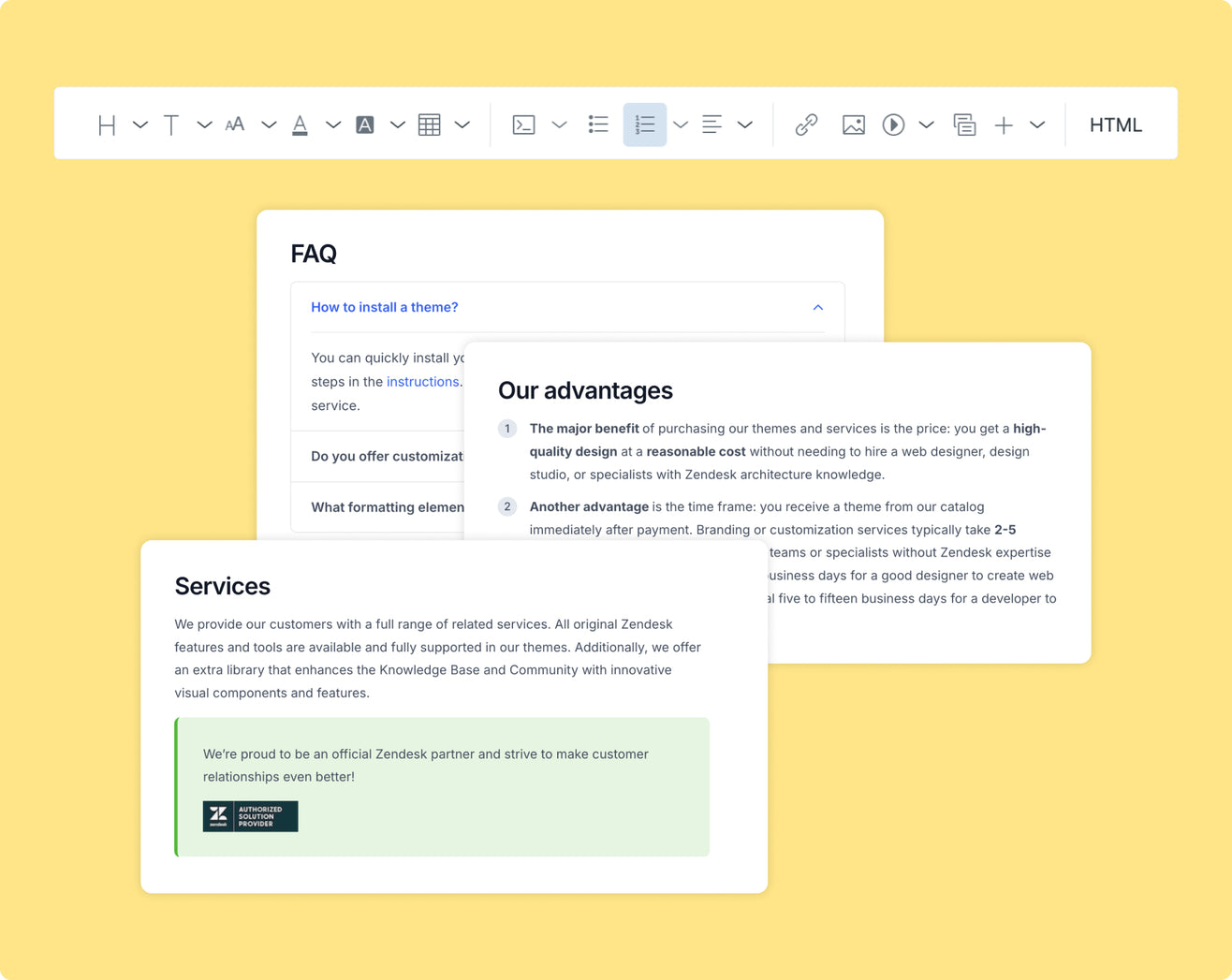If you are worried about losing or modifying your Help Center content while installing any of our themes, don’t be. We take care of it.
